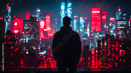 Fototapeta premium City Lights and Solitude: A lone figure gazes upon a vibrant cityscape, where red and blue neon lights paint the night sky, the perfect metaphor for a moment of introspection