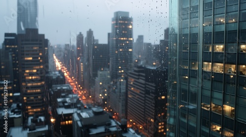 Obraz premium City lights glow in the distance through a rain-speckled window, capturing the essence of a bustling metropolis on a rainy evening.
