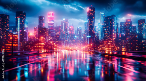 Obraz premium City Lights Reflecting on a Futuristic Waterfront,