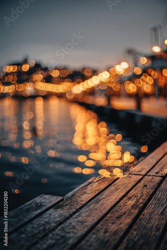 © satisfied, Fototapeta premium City lights reflecting on water seen from a wooden pier at night.
