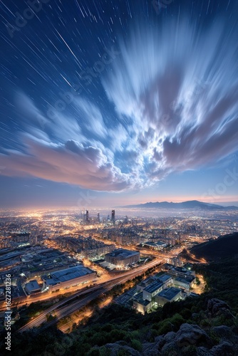 Obraz premium City lights, star trails, and clouds at dawn