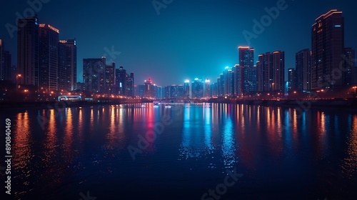 © Ivan, Fototapeta premium City lights starting to turn on, reflecting in the river water