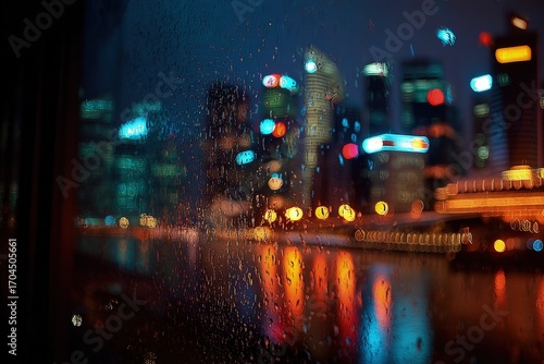 © arcitacreative, Obraz premium City Lights Through A Rainy Window At Night