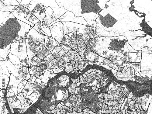 © W&S Stock, Fototapeta premium City map illustration of Johor Bahru, Malaysia, rendered in black and white sketch style.