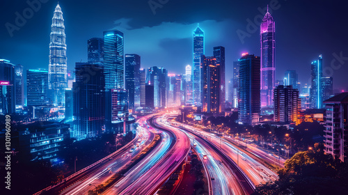 © xuan, Fototapeta premium City nightscape with buildings and light trails
