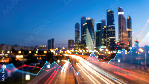 © FoxGrafy, Obraz premium City Nightscape with Digital Finance Trends and Traffic Flow