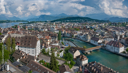 Obraz premium City of Luzern panoramic aerial view. Alps and lake Luzern on background. Switzerland.