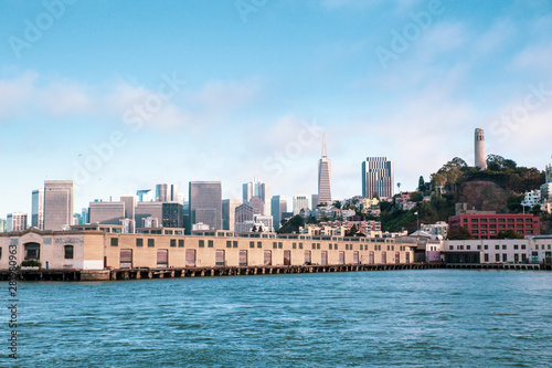 Naklejka premium City of San Francisco California seen from the Bay with boats, docks, wharf and buildings of skyline in view.