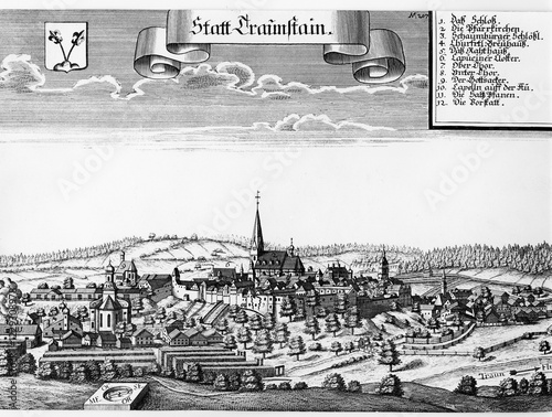 © Fotografie Lisa + Wilfried Bahnmüller/imageBROKER, Fototapeta premium City of Traunstsein, copperplate engraving by Michael Wening, c. 1700, Upper Bavaria, Bavaria, Germany, Europe