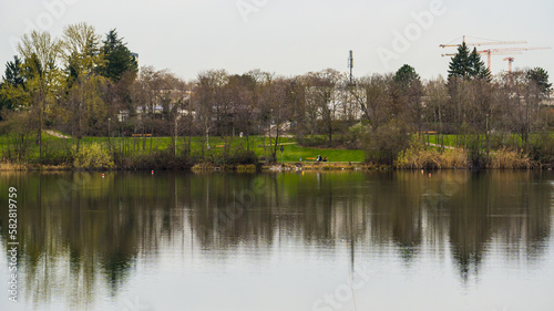 Obraz premium City park with cranes symmetrically reflected in lake water