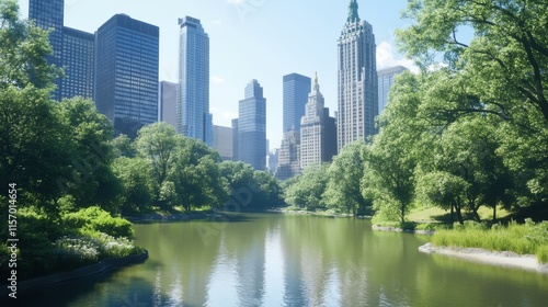© Aris Suwanmalee, Obraz premium City park with skyscrapers and serene water.