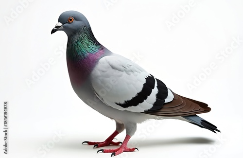 © Pete, Naklejka premium City pigeon bird stands against white background. Ornithology subject, feathered creature, dove family member, avian life form. Single dove, wild animal, domestic bird, birdwatching.