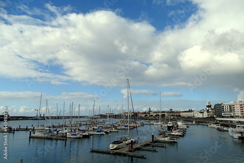 © Ayla Harbich, Naklejka premium City Ponta Delgada, harbor with sailing boats, blue ocean and sky.