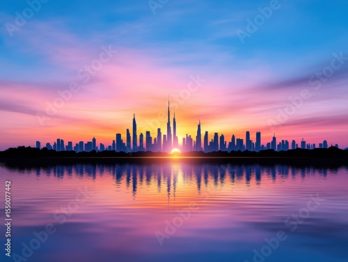 © darion, Fototapeta premium City silhouette at sunset, reflected on water