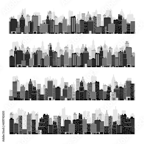 Naklejka premium City silhouettes. Cityscape, town skyline, horizontal panorama. Midtown, downtown with various buildings, houses and skyscrapers. Vector illustration