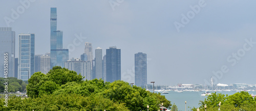 © BradleyWarren, Obraz premium city skyline along shoreline walking path