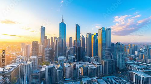© song, Obraz premium City Skyline and Skyscrapers Under Blue Sky and White Clouds Aerial View