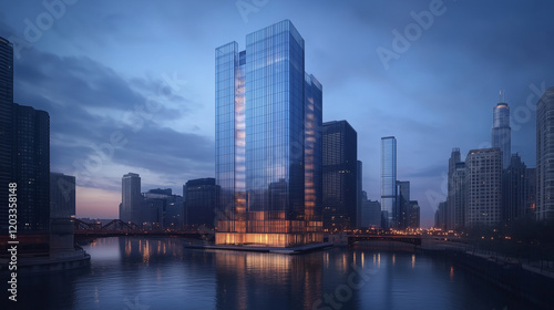 © song, Obraz premium City Skyline at Blue Hour with Modern High-Rise Buildings