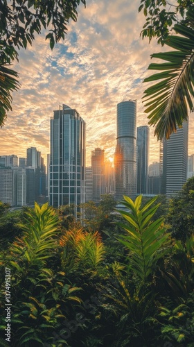© Irfan, Naklejka premium City skyline at dawn with green trees in the foreground