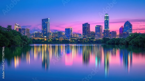 Obraz premium city Skyline at Dusk: A Serene Reflection