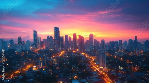 © Nawarit, Obraz premium City skyline at dusk, close-up of glowing city buildings, vibrant dusk sky