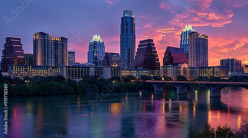 © Maham, Naklejka premium City Skyline at Dusk Illuminated by Twinkling Lights and Skyscrapers