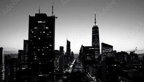 © Cherrisa, Fototapeta premium City skyline at dusk in black and white.