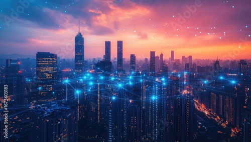 © lumpia, Fototapeta premium City skyline at dusk, network overlay