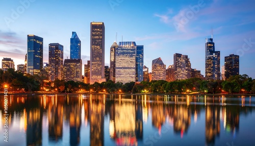 © Diko, Naklejka premium City skyline at dusk reflected in calm water