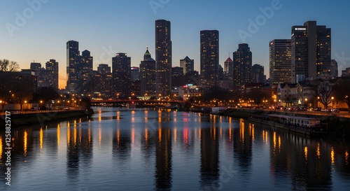 © abangaboy, Obraz premium City Skyline at Dusk Reflecting in River Downtown Cityscape