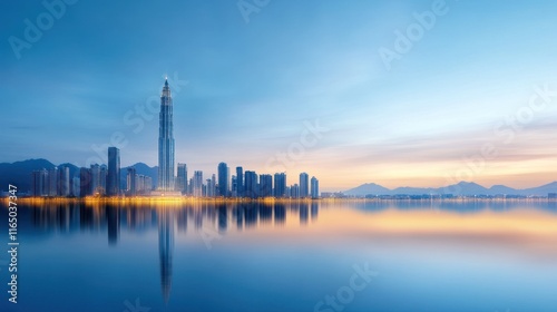Naklejka premium City skyline at dusk reflecting on calm water.