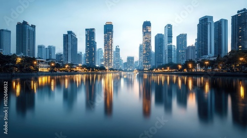 Fototapeta premium City skyline at dusk reflecting on calm water, serene urban landscape with...