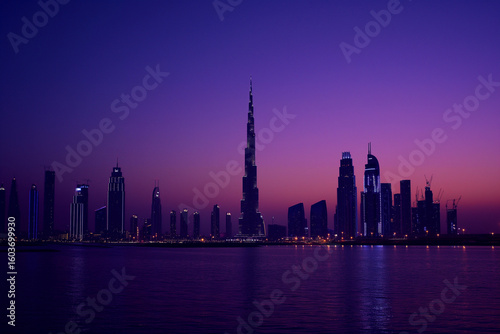 © Semuda art , Fototapeta premium City Skyline at Dusk Reflecting on the Water