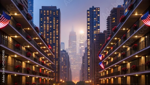 © CreativeLoom, Obraz premium City skyline at dusk with buildings and flags lining the streets. independence day concept