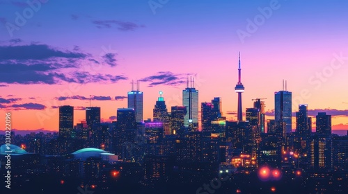 © Ali, Fototapeta premium City skyline at dusk with colorful sky.
