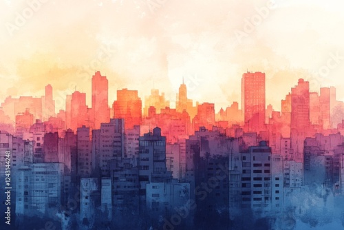 © Andrii Savchuk, Obraz premium City skyline at dusk with glowing orange lights
