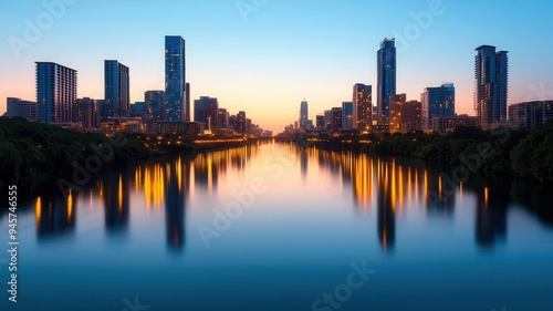 © Panisara, Fototapeta premium City skyline at dusk with glowing skyscrapers reflecting on a calm river, urban glowtime, serene and modern