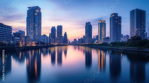 Naklejka premium City skyline at dusk with glowing skyscrapers reflecting on a calm river,...