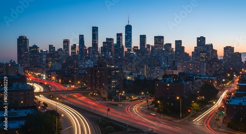 © arazka, Fototapeta premium City skyline at dusk with highway traffic