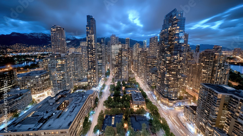 © siraphol, Obraz premium City skyline at dusk with illuminated buildings and vibrant atmosphere