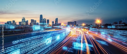Fototapeta premium City skyline at dusk with light trails and digital data
