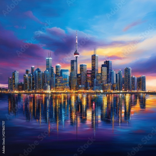 © boy 3344, Obraz premium City Skyline at Dusk with Reflections
