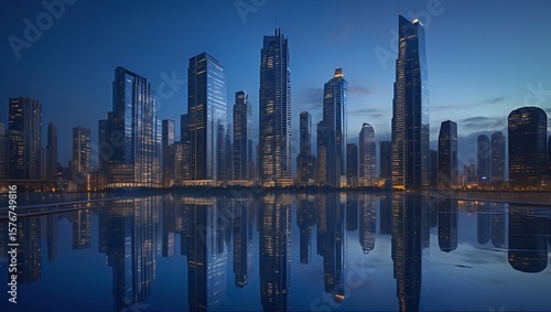 Fototapeta premium City Skyline at Dusk with Reflections in Water cityscape