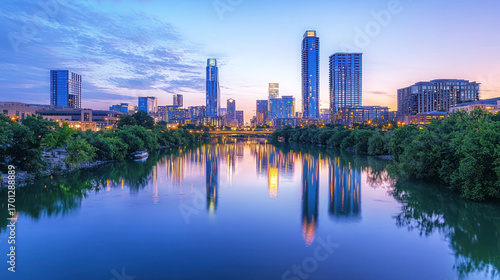 Obraz premium City skyline at dusk, with skyscrapers lit up and a calm river reflecting the...