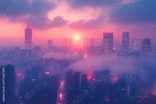 © Tanu, Fototapeta premium City skyline at dusk with vibrant colors reflecting off buildings and fog in the air