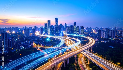 © MRSUTIN, Naklejka premium City skyline at dusk with vibrant light trails on a complex highway interchange.