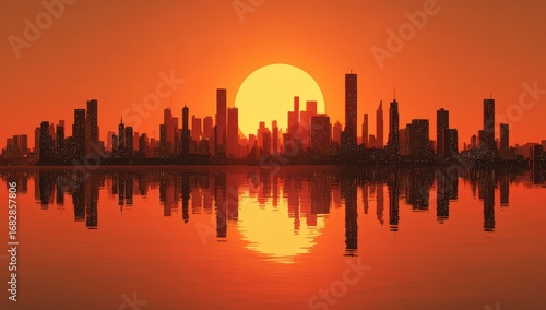 © Indrawan, Obraz premium City skyline at fiery sunset reflected in water
