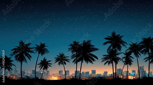Obraz premium City skyline at night, palm trees silhouettes, starry sky