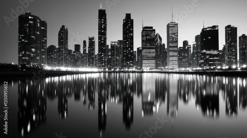 © mas, Fototapeta premium City skyline at night, reflected on water, urban scene, potential stock photo