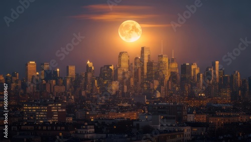 © Helois, Fototapeta premium City skyline at night with a full moon